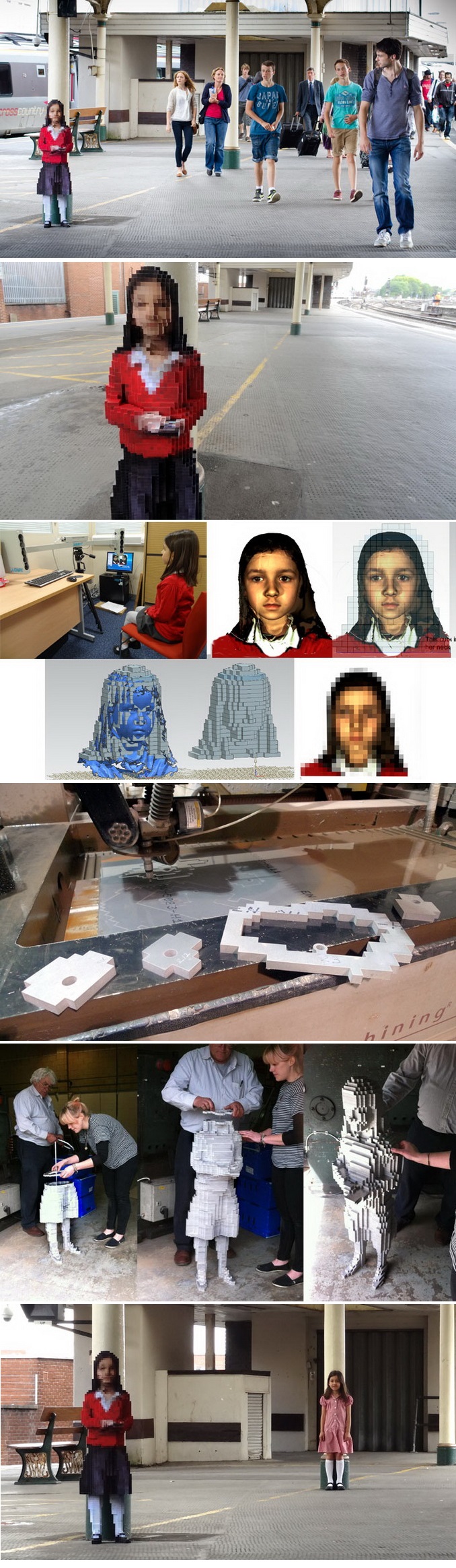 Представляют вам Майю - пиксельную скульптурную инсталляцию в виде маленькой девочки на платформе 1 на Бристольском железнодорожном вокзале. Автор скульптуры ее отец Люк Джеррам (Luke Jerram). Как вы можете увидеть, ее изображение превратили в 3D модель и сделали из них уникальные детали.
