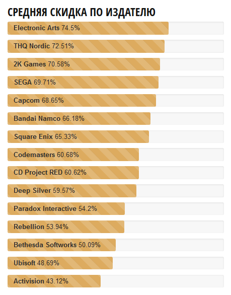 За счет горы старья, которое не увезли в Origin, Electronic Arts смогли выдать лучшую среди всех издателей скидку. Bethesda обманчиво занимает третью строчку "жадности". Однако, незадолго до распродажи издатель скинул базовые цены на свои товары. Так что Беседка не так алчна как кажется. Отсюда и DOOM, и Fallout 4 по 429 рублей.