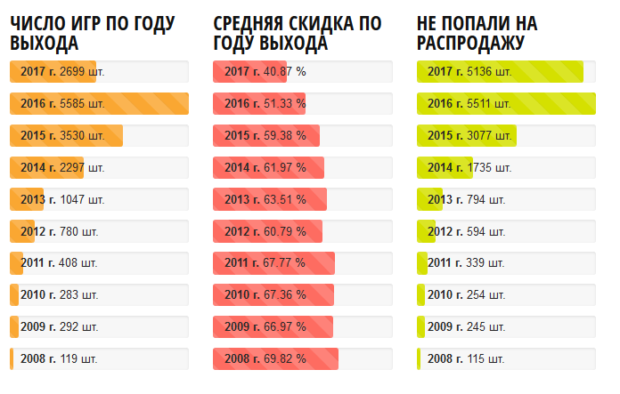 Более половины игр, участвующих в летней распродаже, не старше трех лет. На игры прошлого года обычно уже можно получить скидку 50%, но даже старые игры с неохотой отдают со скидкой более 66%.