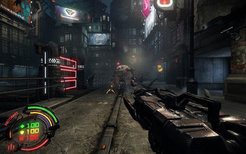 Первое, что видишь запуская Hard Reset - потрясающая работа художников, создавших невероятно красивый и детализированный город будущего. Потоки летающих машин, огромные рекламные экраны, темные и сырые улицы. Игрок сразу понимает куда попал - киберпанк во всей красе. Однако, как только дело доходит до первой схватки, понимаешь что внешний вид в таких играх не так важен, как хороший дизайн уровней. Когда на вас выбегает толпа врагов развернутся попросту негде. Сами враги тоже выглядят весьма странно - мелкие кусачие попрыгушки, зомби, огромные гарилообразные роботы- неужели для такой красивой игры нельзя было придумать что-то более оригинальное?