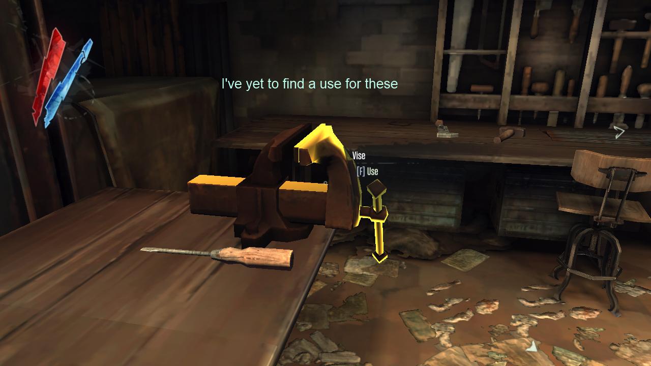 Диегетическая механика имеет тенденцию отклоняться от классических механик и может быть сугубо индивидуальной для каждой игры. Например, в Dishonored, вы можете подойти к тискам, нажать на кнопку и это активирует анимацию, как тиски разожмутся и из них выпадет то, что было зажато. Во-первых, этой действие одинокого происходит как для вас, так и для вашего персонажа. Во-вторых, это делает игровой мир более приземленным и показывает, что вы можете взаимодействовать с ним.