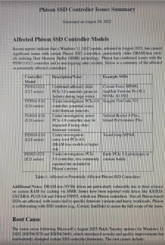 Как пишет издание Tom's Hardware, вскоре после появления информации о сбоях в работе SSD и HDD, в сети распространился документ со списком контроллеров Phison, предположительно затронутых этой проблемой.