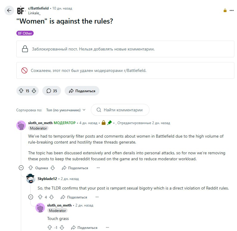 На сабреддите, посвященном серии игр Battlefield, модераторы временно ввели запрет на использование слова женщина. Это решение было принято в связи с большим количеством комментариев, нарушающих правила площадки и разжигающих вражду.
