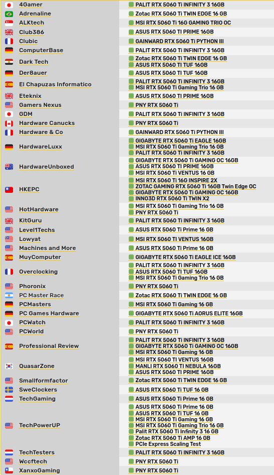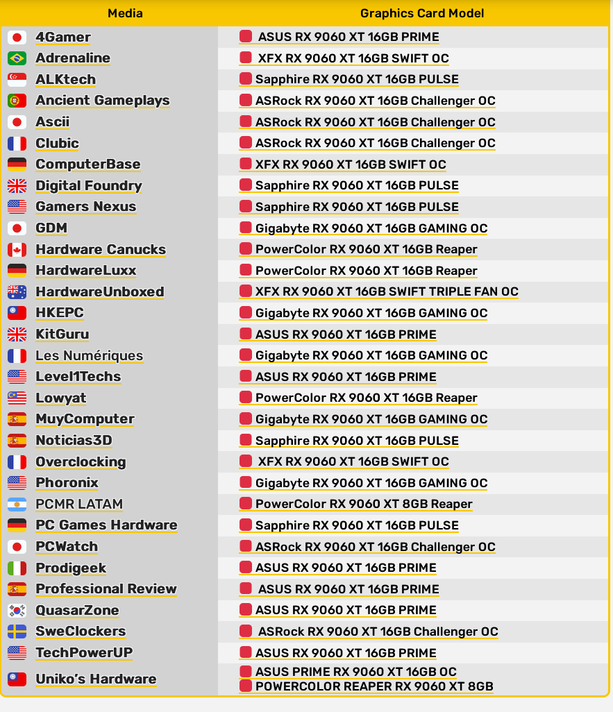 Карта, затычка в хорошем смысле. Тем не менее имеющая полноценный физический интерфейс PCIe X16. Использование 8 пинового разъёма даёт возможность не быть в зависимости практически от питания порта PCIe на материнки. Будет кстати интересно посмотреть, когда появится RX9060 на 8 гигов и сравнить её с героем новости. Правда после откровенного хамства с доступностью обзоров RX9060XT на 8 гигов со стороны АМД в это верится с трудом. А вот в чем дело. Из-за практически отсутствия обзоров 8 гиговых версии и критики по этому поводу АМД несет откровеную чушь в оправдение этого. Типа рассылка карт исходя из регионального спроса. Говоря проще мы решаем стоит ли вам высылать 8 гиговую версию RX9060XT. Как говорится снова видим хамское отношение к общественности и тем же обзорщикам некоторые их которых ранее громили Нвидиа за подобное касательно своих карт 5060Ti на 8 Гигов. Вот кстати как выглядит список обзоров на одном известном ресурсе как говорится, почувствуйте разницу между 16 гиговыми и 8 гиговыми версиями.
