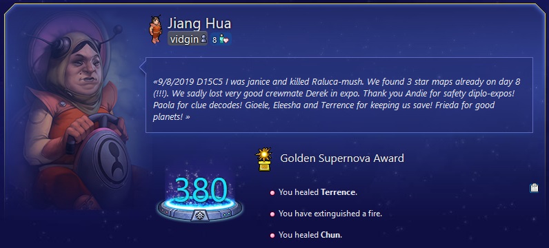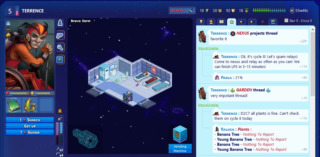 Но всё это не работало бы, если бы не скорость игры. Здесь придумана система "циклов", равная трем часам. Каждые три часа случаются события на корабле (что то ломается, что то горит, прилетают новые истребители врагов, на горизонте появляется астероид, с вами связываются торговцы и т.п.). Таким образом за сутки случается восемь событий. По сути чтобы быть очень активным игроком, достаточно зайти в игру три раза в день и при этом вы получите максимум необходимой информации о том, что происходит на борту и что от вас требуется сделать. Подобная система циклов позволяет играть в одну сессию днями и даже неделями. Сейчас средняя продолжительность одной игры 4-10 дней. Раньше она доходила до 10-20 дней. За две три недели успеваешь сдружиться с командой, пережить множество приключений и опасности, сходить в экспедиции на опасные планеты, убить предаталей или наоборот погибнуть от их рук. При этом сложность игры постоянно возрастает. Каждые пять дней количество происшествий растет и лишь самые слаженные и активные команды могут продержаться 15 или 20 дней, не потеряв жизни. Конечная цель людей: вернуться в Солнечную систему.
