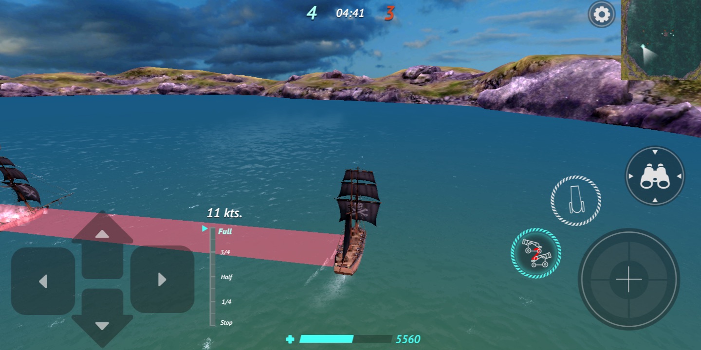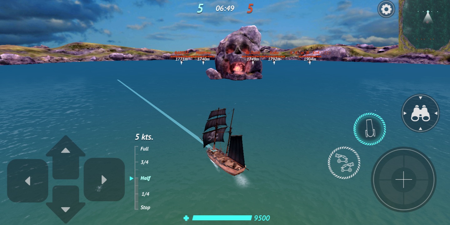 Разработчикам отлично удалось реализовать управление — в левой части экрана расположены стрелки для хода вперёд/назад и поворотов влево/вправо. Набираем скорость, наносим урон, поворачиваем и маневрируем, пока идёт перезарядка орудий. Кстати, в правой части экрана у нас расположена клавиша атаки (большая такая, с прицелом) и кнопки смены пушек. Одна бьёт вперёд, вторая позволяет делать залп из боковых орудий. Советую комбинировать оба варианта, тогда можно быстрее нанести тонну урона. Пора в бой!