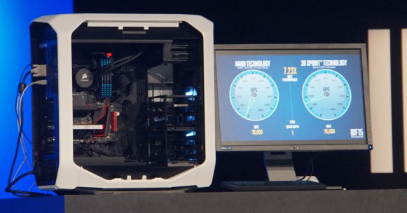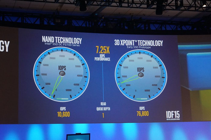 Прототип SSD на памяти 3D XPoint был выполнен в формфакторе с шиной PCI Express. В качестве соперника ему противостоял один из быстрых накопителей Intel — PCIe-модель DC P3700 (устоявшиеся скорости чтения и записи достигают 2,8/1,9 Гбайт/с, а значения IOPS для случайных чтения и записи — 460000/180000 операций). В ходе соревнования накопитель на памяти 3D XPoint по показателям IOPS в 5-7 раз превзошёл скорость работы SSD DC P3700. Это не то 1000-кратное превосходство, которое декларирует Intel, рассказывая о достоинствах 3D XPoint, но тоже впечатляет.