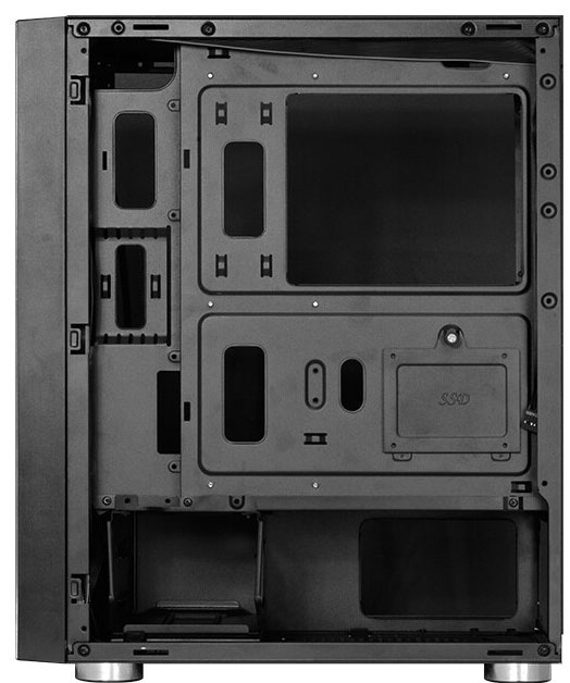Панель ввода-вывода оснащается портами USB 3.0, USB 2.0 и двумя аудиоразъёмами Mini-Jack. Производитель отмечает использование верхних и нижних пылевых фильтров, отдельного отсека блока питания и каналов для аккуратной прокладки кабелей.