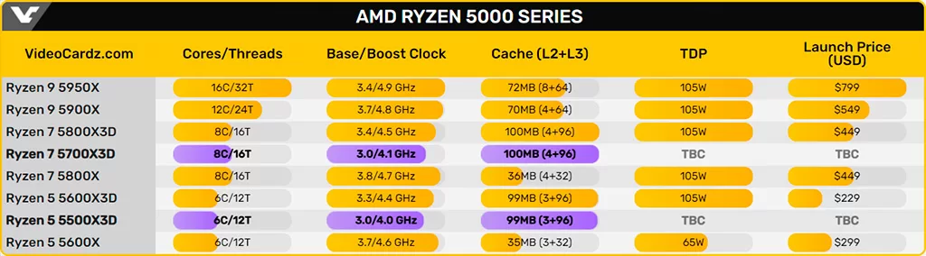 Теперь сообщается, что AMD готовит Ryzen 7 5700X3D и Ryzen 5 5500X3D. Они получат аналогичное старшим собратьям количество кэша третьего уровня, такое же количество ядер/потоков, но на 400 МГц меньшие частоты работы – «буст» до 4-4,1 ГГц. Внушительное количество кэша третьего уровня обеспечит хорошее быстродействие в играх. Детальные характеристики в таблице: