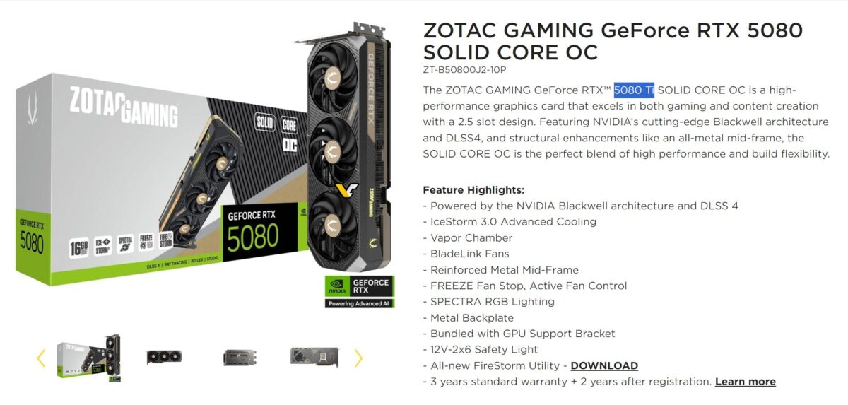 Очевидный ответ заключается в том, что NVIDIA внесла изменения в последнюю минуту, и то, что мы видим, — это остатки. Однако MSI — не единственный случай, когда другие производители, по-видимому, считают, что должно выйти (или уже вышло) что-то лучше, чем 5080. Например, ZOTAC во многих местах на своём сайте показывает RTX 5080 Ti, что кажется довольно странной ошибкой, учитывая, что карта вышла более двух месяцев назад.