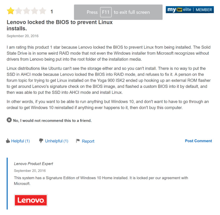 Многие пользователи привыкли к свободе выбора операционной системы, даже в случае покупки ноутбука с предустановленной ОС. Но пользователи моделей Lenovo Yoga 900S и Yoga 710S столкнулись с невозможностью установки альтернативы в виде Linux, поскольку сами лэптопы комплектуются предустановленной ОС Windows 10 Signature Edition.