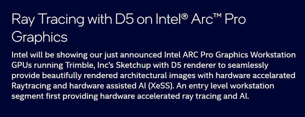 Intel упоминает аппаратное ускорение RayTracing и задач AI с помощью технологии XeSS. А также отмечает, что эти функции впервые появятся в адаптерах для рабочих станций начального уровня.