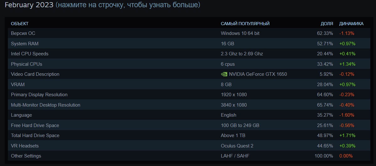 В Steam появились свежие данные по оборудованию пользователей за февраль 2023 года. Лидер в сегменте видеокарт не изменился — позиция осталась за NVIDIA GeForce GTX 1650, на второй строчке NVIDIA GeForce GTX 1060, на третьей — NVIDIA GeForce RTX 3060 Laptop GPU. Среди ОС лидерство сохраняет Windows 10, однако Windows 11 догоняет предшественницу.