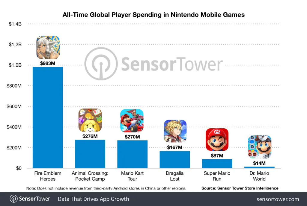 Эта сумма была накоплена благодаря таким играм, как Fire Emblem Heroes, Animal Crossing: Pocket Camp, Mario Kart Tour, Dragalia Lost, Super Mario Run и Dr. Mario World. Из них, безусловно, самым большим хитом была Fire Emblem Heroes, только одна она принесла почти миллиард долларов в казну большого N. Другие игры в линейке мобильных устройств Nintendo приносят медленный, но стабильный доход, за исключением Dr. Mario World, который, похоже, является еще одним проектом, который изо всех сил пытается найти свою аудиторию или не подталкивает клиентов к совершению внутриигровых покупок.