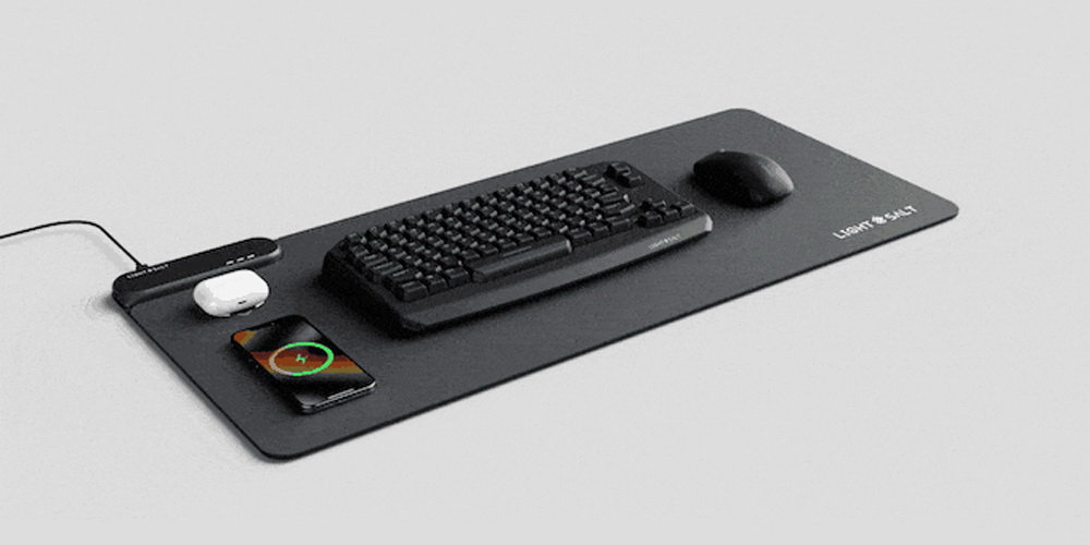Есть такая дорогая (~50к) дичь под названием JSD (производитель - Light & Salt Interactive) - по сути это комплект из коврика (с беспроводной зарядкой) и клавиатуры с мышкой (со встроенным аккумулятором)(которые постоянно заряжаются от коврика, причём по всей поверхности)