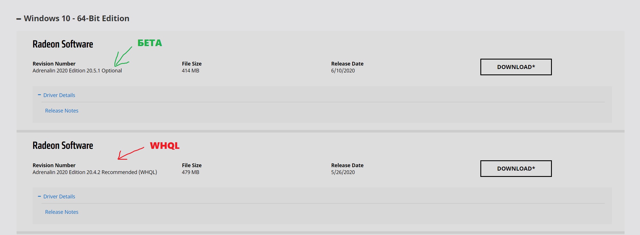 ksoper Версия драйвера 20.4.2 вышла 24 апреля и имела статус Optional, т.е. бета, а уже 26 мая эта же версия получила сертификат (WHQL) и стала рекомендованной. Так что смена версии происходит лишь при обновлении, то никак не при переводе из беты в стабильную. https://www.comss.ru/page.php?id=7381