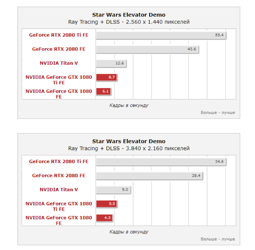 В демо Reflections на видеокартах GeForce RTX используются эффекты RTX, дополненные DLSS. На старых видеокартах GeForce DLSS работать не будет. Поэтому мы не можем сказать, как отсутствие DLSS сказывается на производительности. Поскольку DLSS выполняет рендеринг в низком разрешении, видеокарты GeForce RTX 2080, GeForce RTX 2080 Ti и, вероятно, NVIDIA Titan V показывают из-за этого более высокую производительность, несмотря на активированные эффекты RTX.