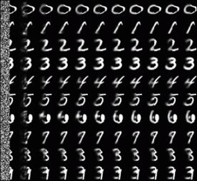 Картинка, иллюстрирующая каким образом интуитивный ИИ догадывается о содержании частично недоступной информации. В левом углу снимка столбец цифр, наполовину закрытых пиксельным «шумом». Анализируя расположение видимых пикселей, ИИ восстанавливает отсутствующий кусок информации