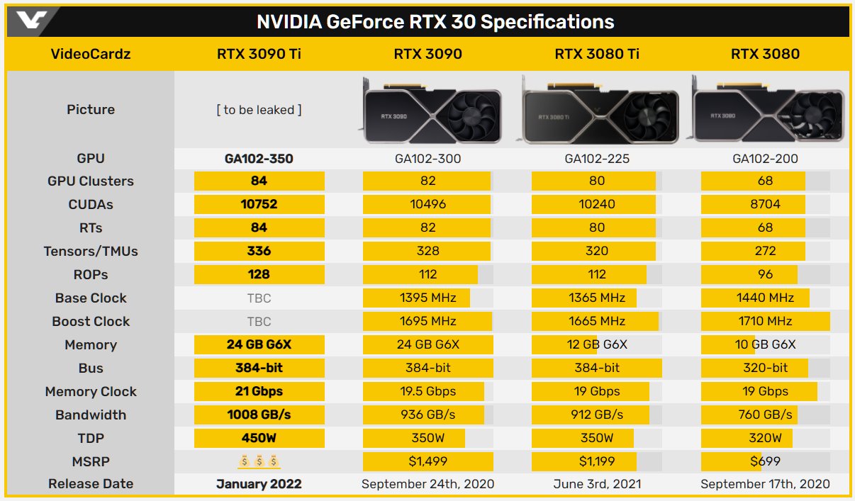 Источники среди партнеров NVIDIA поделились первой информацией касательно новой флагманской видеокарты. Она получит название GeForce RTX 3090 Ti, а не RTX 3090 SUPER. В основе находится версия GPU GA102 с поддержкой 10 752 ядер CUDA. Показатель TDP новинки достигнет 450 Вт, что на 100 Вт выше, чем у RTX 3090. Однако это цифра еще не финальная.