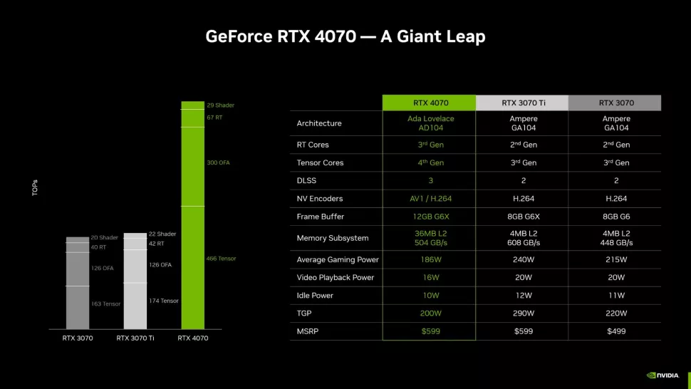 RTX 4070 будет иметь рекомендованную розничную цену в размере $599 и иметь ту же архитектуру Ada Lovelace, что и предыдущие выпуски серии 40. Кроме того, производительность с ускорением ИИ будет представлена в виде DLSS 3.