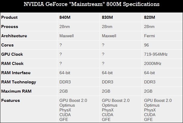 На мэйнстрим-рынок ориентированы изделия GTX 840M и GTX 830M на архитектуре Maxwell, а также GTX 820M на архитектуре Fermi. Все названные решения поддерживают 2 Гбайт памяти DDR3.