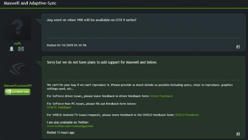 Также служба поддержки NVIDIA на официальном форуме сообщила нерадостную новость для владельцев видеокарт с архитектурой более старой, чем Pascal: им не будет доступен режим совместимости с G-Sync. То есть адаптивная синхронизация на мониторах с FreeSync возможна только в паре с видеокартами серии GeForce 10, GeForce 20 и выше. В коротком сообщении компания отметила, что не планирует добавлять поддержку Maxwell и других старых архитектур.