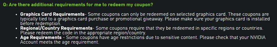 В руководстве по погашению кодов появилось описание дополнительных требований. Помимо региональной привязки и возрастных ограничений есть и более серьезное требование: теперь некоторые купоны могут быть успешно погашены, только если у владельца купона есть соответствующая видеокарта. Проверка будет осуществляться с помощью клиента GeForce Experience.