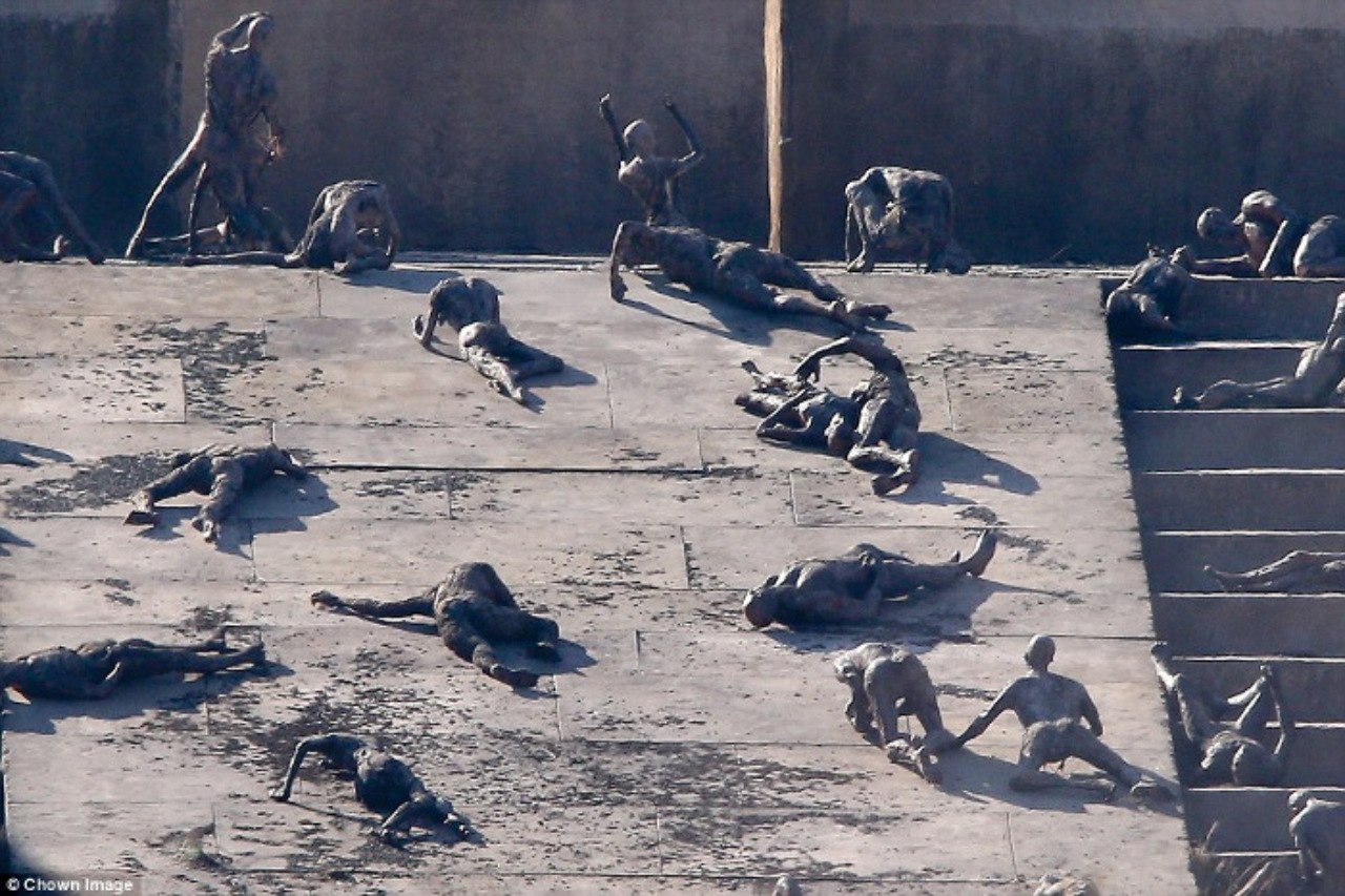 Помимо статуй в глаза бросаются обугленные и застывшие в агонии трупы.