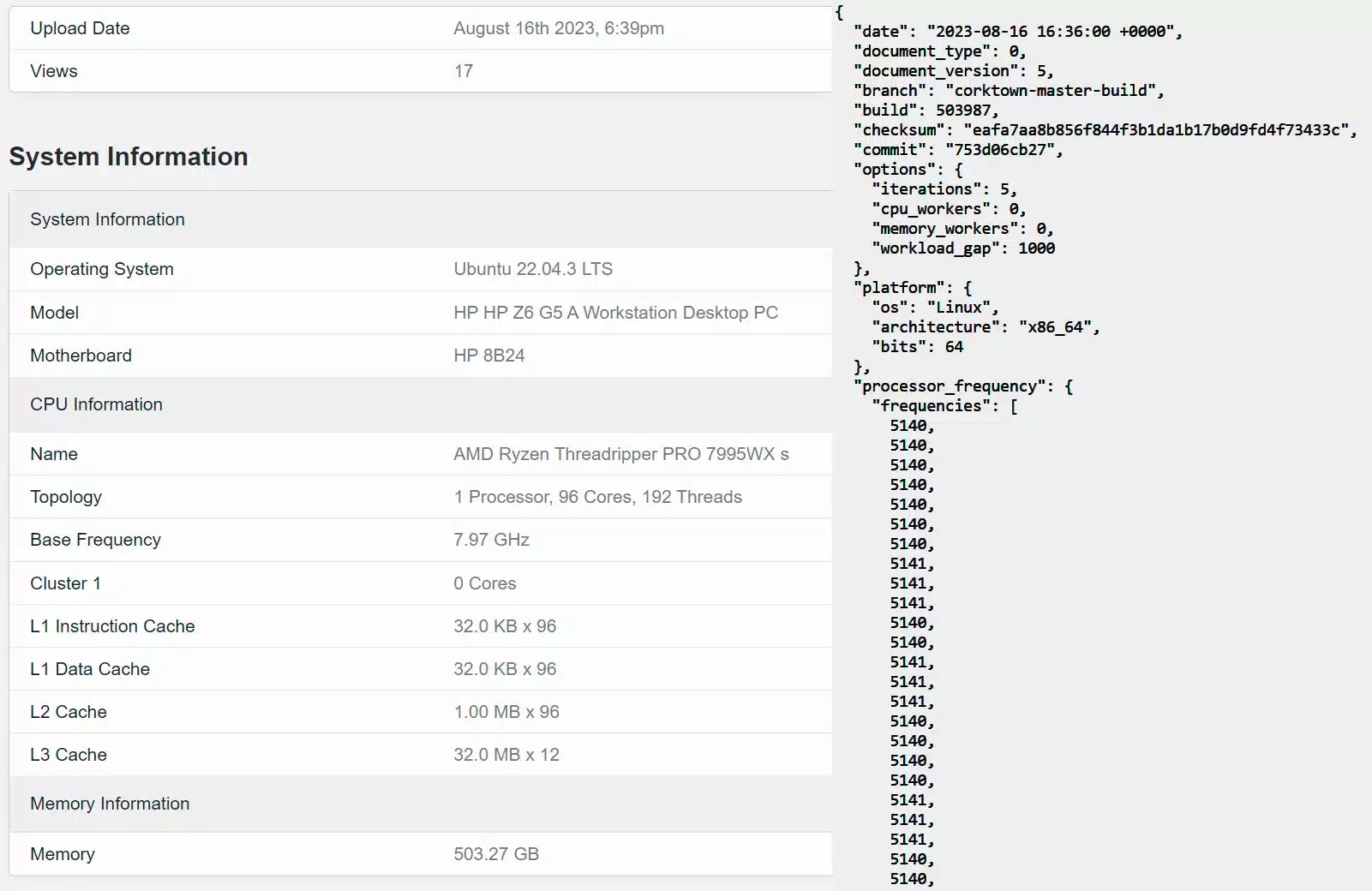Процессор был протестирован в составе рабочей станции HP Z6. Geekbench корректно определил большинство параметров, но не все. Номинальная частота в 7,97 ГГц явно завышена. В детальном описании можно найти упоминание «буста» до 5,14 ГГц.