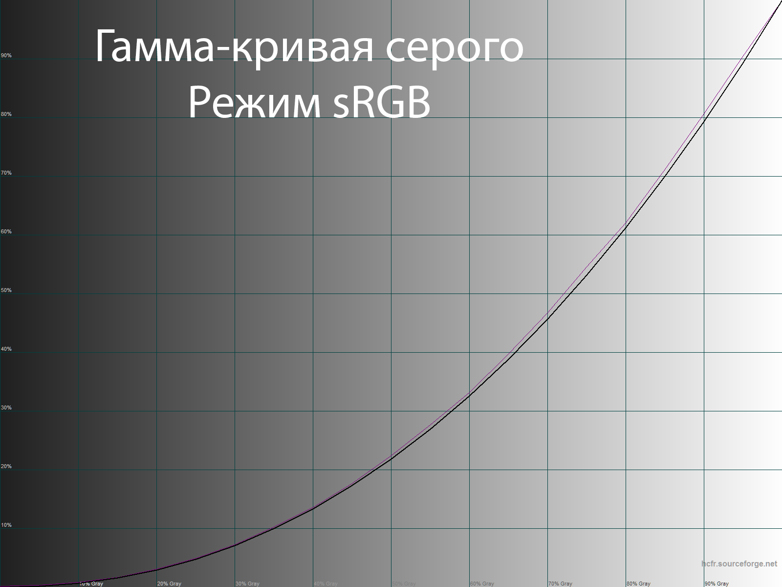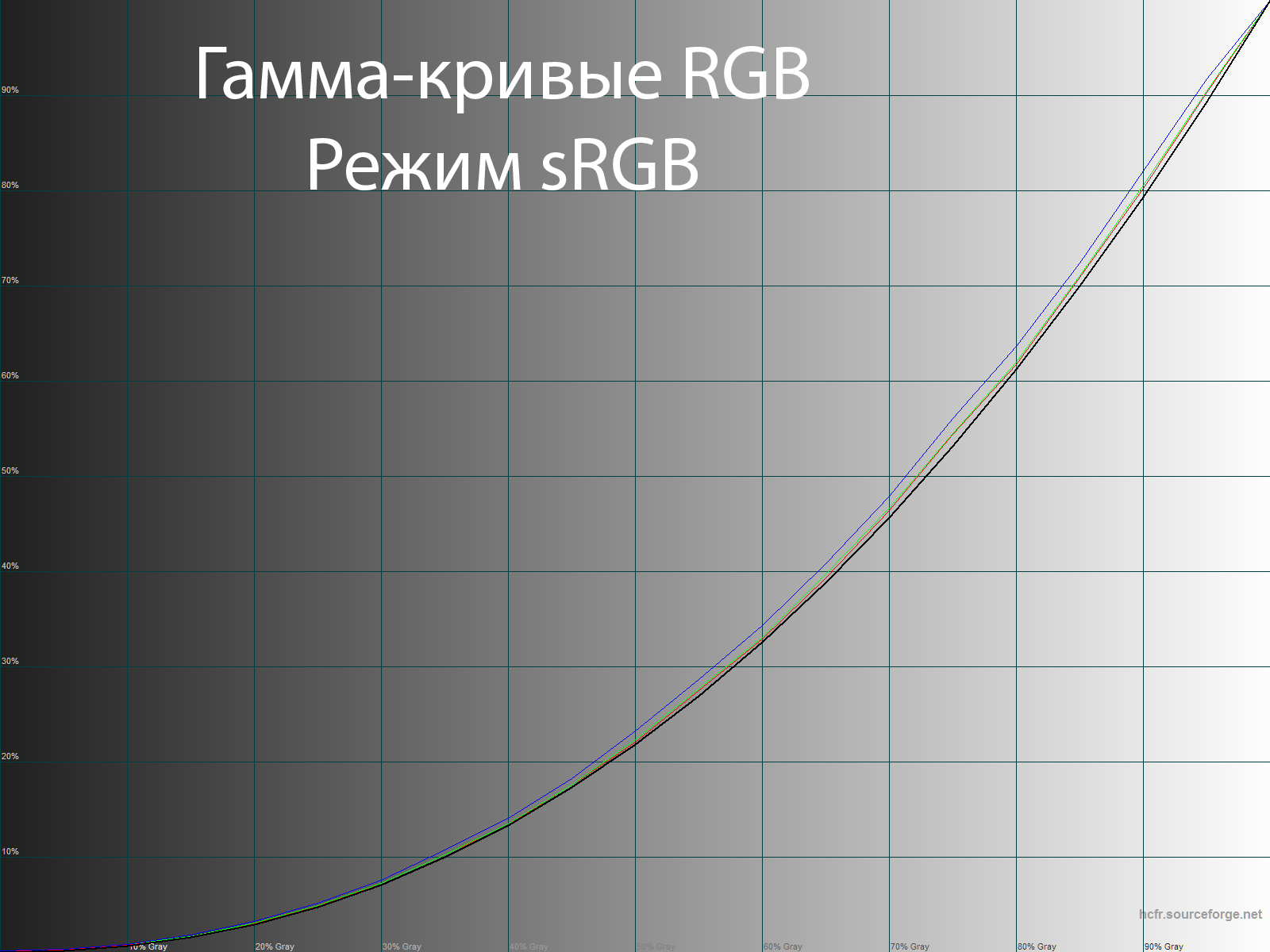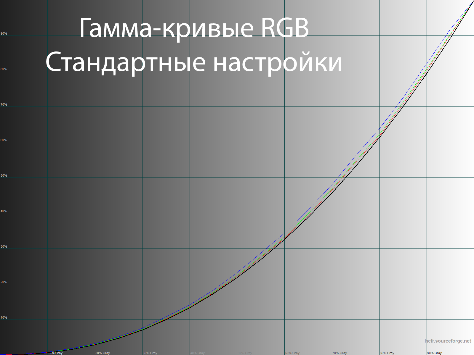 Все линии гамма-кривых оказываются несколько выше референсной кривой, особенно в диапазоне 40-90 %. Из-за этого многие оттенки в этой области выглядят более яркими. Изображение на экране монитора менее контрастное, чем должно быть на самом деле.