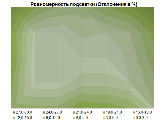 Среднее отклонение от центральной точки составило 8,3 %, максимальное не превысило 21 %. Результат ниже среднего, но для монитора со столь большой диагональю и без системы компенсации неравномерности подсветки это простительно. Основными проблемными зонами являются два верхних угла панели, где и были обнаружены максимальные отклонения от центра.