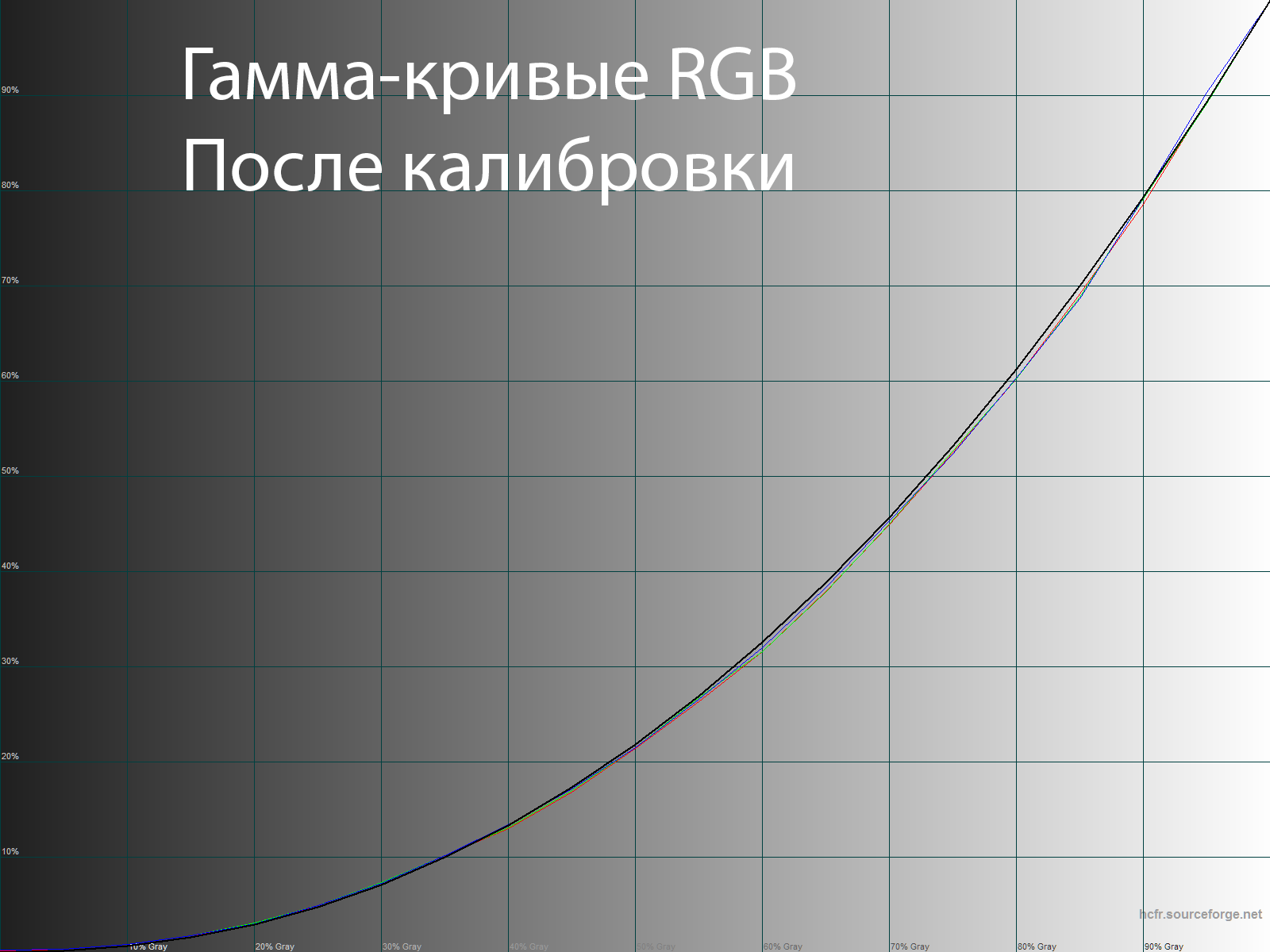 Гамма-кривая серого и кривые трёх цветовых каналов приблизились к референсной линии. Правки в LUT видеокарты потребовались незначительные, поскольку после ручной настройки гамма-кривые сдвинулись в нужном направлении.