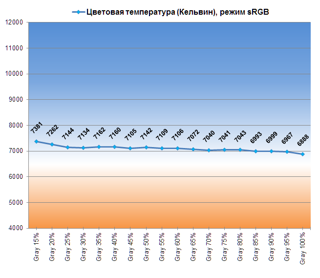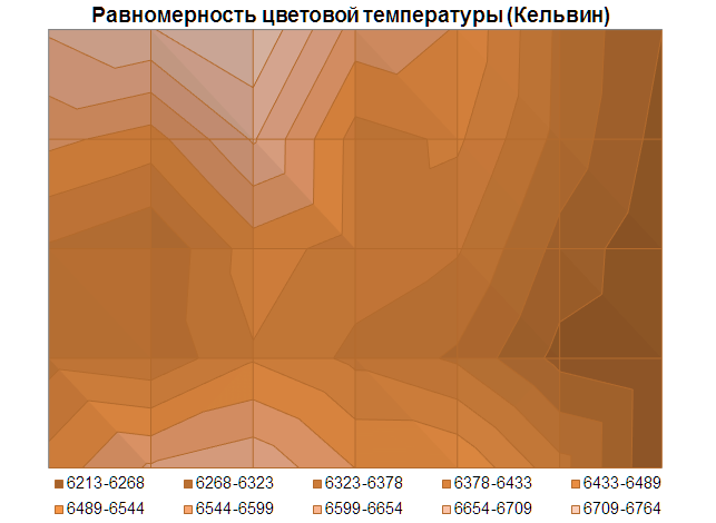 Аналогичная ситуация наблюдается с цветовой температурой. Разброс значений находится на том же – среднем — уровне. Точность настройки точки белого так же вызывает нарекания.