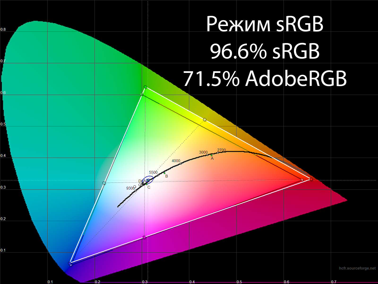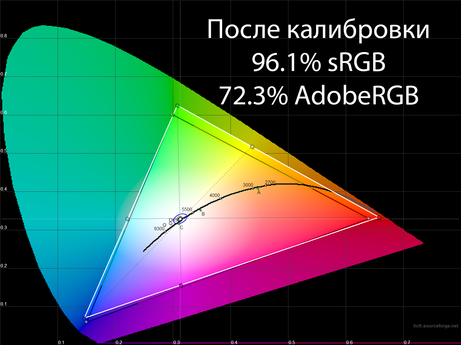 Тестирование показало, что он практически не отличается от заводских установок по умолчанию. Цветовой охват остался на уровне в 96,6 % sRGB и 71,5 % AdobeRGB. Разницу в 0,1 % в первом случае будем считать погрешностью измерений.