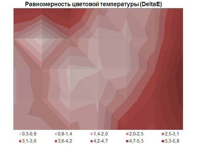 - равномерность подсветки, равномерность цветовой температуры (в градусах Кельвина и единицах отклонения DeltaE) при яркости в центральной точке 100 кд/м2.
