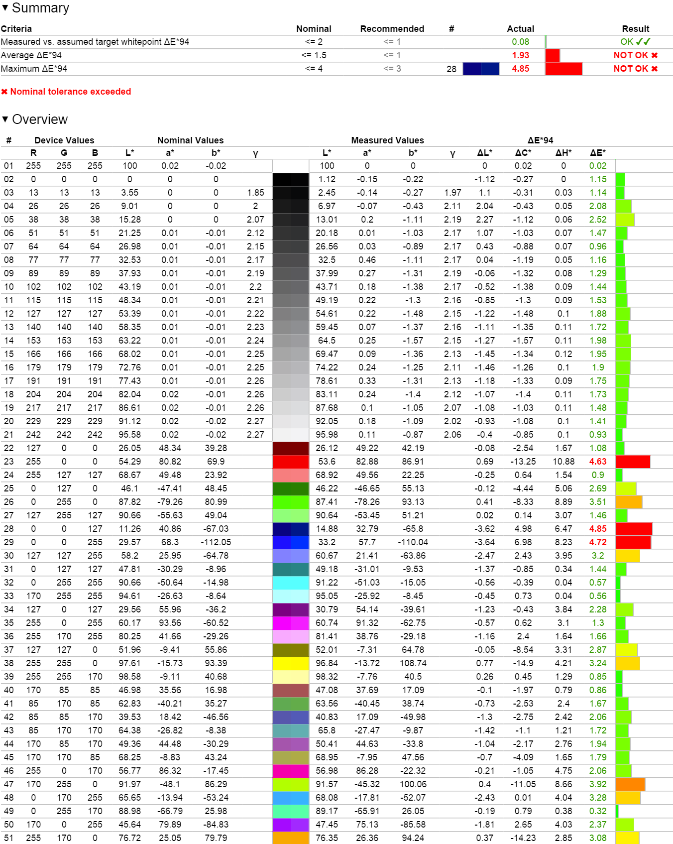 Отклонения цветопередачи, выраженные в единицах DeltaE94, снизились до уровня 0,43 в среднем и 0,97 в максимуме. Великолепный результат. В таком состоянии монитор BenQ BL3201PT прекрасно подходит для профессиональной работы с цветом.