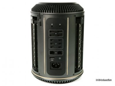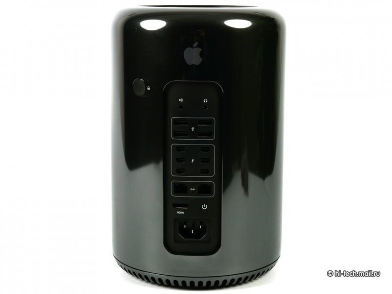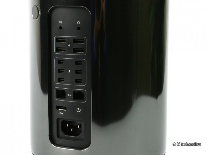 Все разъемы выстроены в два столбика и расположены сзади, в корпусе предусмотрительно создано отверстие, в котором видно пластиковую часть, на которой находятся все разъемы. Mac Pro получил 6 разъемов Thunderbolt 2, это больше, чем у любого другого устройства Apple. Рассчитанное на работу с видео, устройство позволяет одновременно выводить изображение на 3 4К-монитора с разрешением 3840 х 2160 точек! Либо, как вариант, использовать 6 дисплеев с разрешением 2560 х 1440 точек. Самих по себе аксессуаров и устройств с такими разъемами все еще немного, однако здесь есть еще и универсальный HDMI. Правда, он всего один.