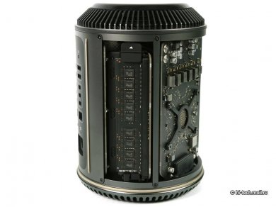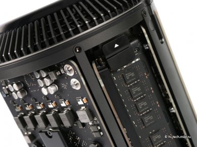 Добраться до внутренностей Mac Pro очень просто. Требуется освободить крепление при помощи рычажка, расположенного рядом с интерфейсными разъемами, после чего можно снять корпус. Пожалуй, это самый удобный из всех компьютеров Mac по части доступа к начинке. Отсюда можно увидеть платы видеокарт, SSD в слоте PCIe, а также четыре отсека для оперативной памяти, которую легко заменить самостоятельно в случае необходимости. SSD крепится на одной из видеокарт, так что теоретически, если поставить вторую такую же, то можно было бы вдвое увеличить дисковое пространство. Однако о серийных возможностях такой модернизации ничего не известно. При желании можно добраться и до процессора, применяется сокет LGA 2011. Но стоит помнить. что для этого придется разобрать Mac Pro на запчасти.