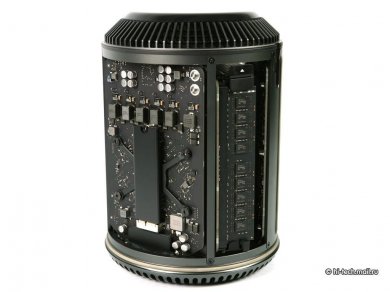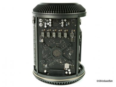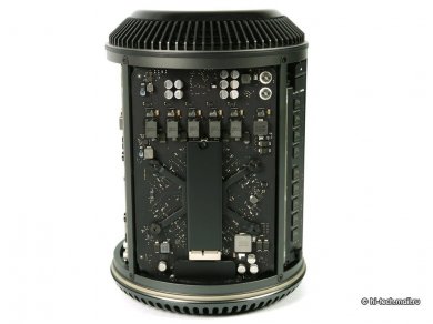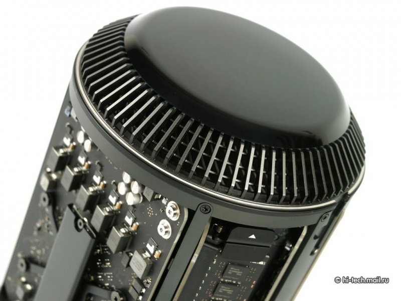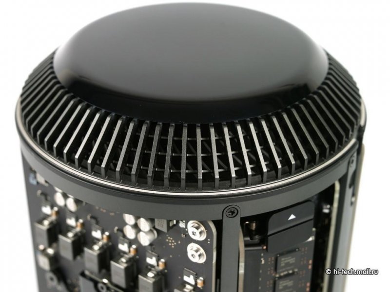 Это маленькое инженерное чудо, ведь раньше в большом корпусе Mac Pro помещалось 8 кулеров, теперь их число резко уменьшилось и за все отвечает лишь один, который охлажадает процессор и видеокарты.