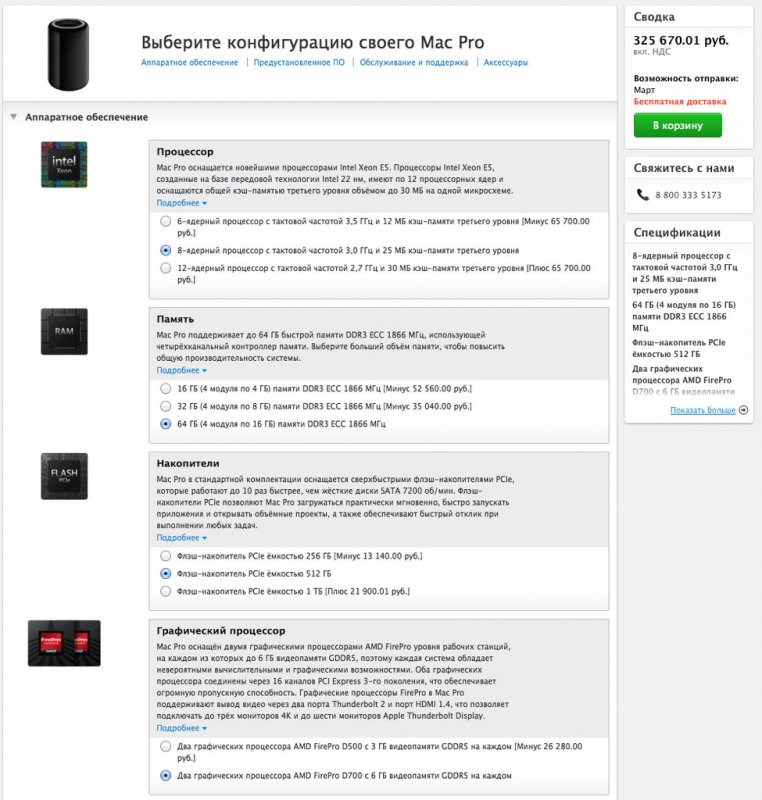Большинство, если не всех типичных пользователей, не знакомых с миром профессиональной техники, повергает в шок цена устройства. В России за младшую версию компьютера просят от 124 990 рублей, а самая-самая мощная версия стоит более 400 тысяч. Наша тестовая версия стоила почти 326 тысяч рублей. Именно такой ценник можно увидеть, если зайти на сайт Apple и выбрать используемые компоненты: 8-ядерный процессор, 64 ГБ оперативной памяти, SSD на 512 ГБ, две видеокарты D700.
