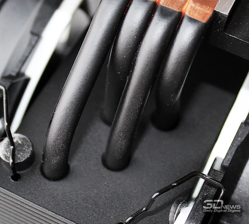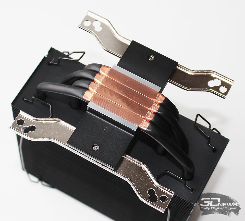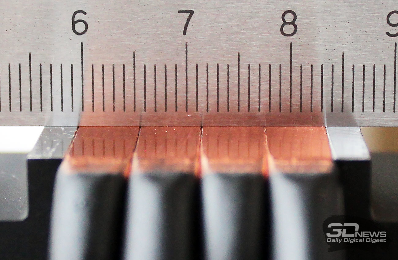 Напомним, что радиатор состоит из 49 алюминиевых пластин толщиной 0,5 мм, напрессованных на тепловые трубки с межрёберным расстоянием 1,8 мм. При этом площадь радиатора составляет 5530 см2, а количество тепловых трубок диаметром 6 мм равно четырём.