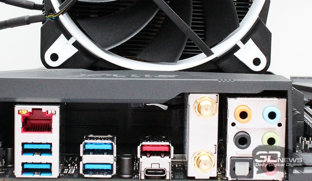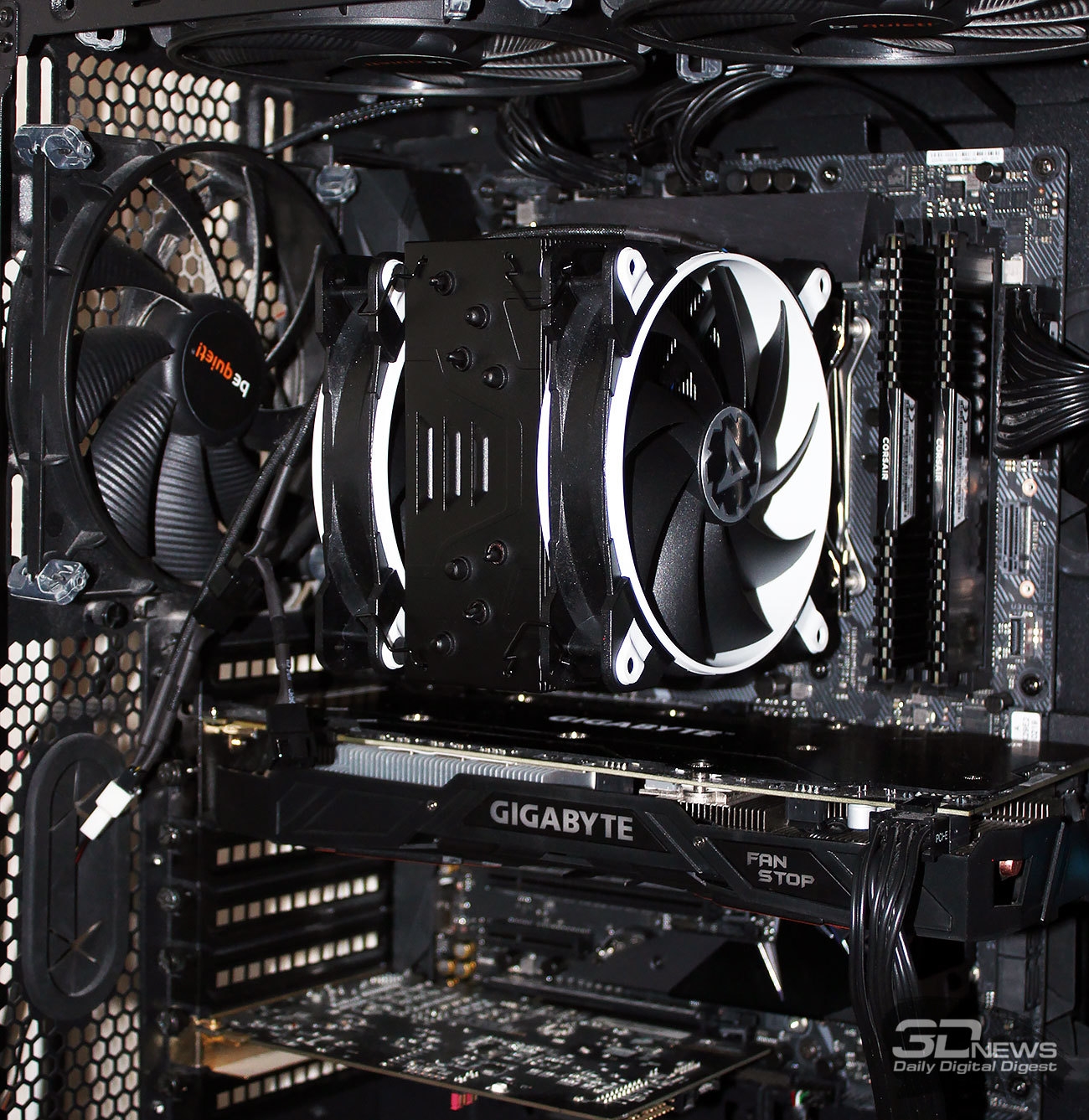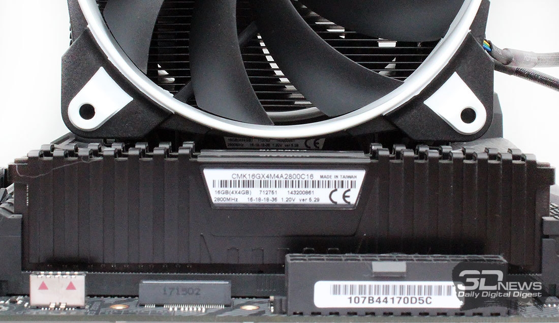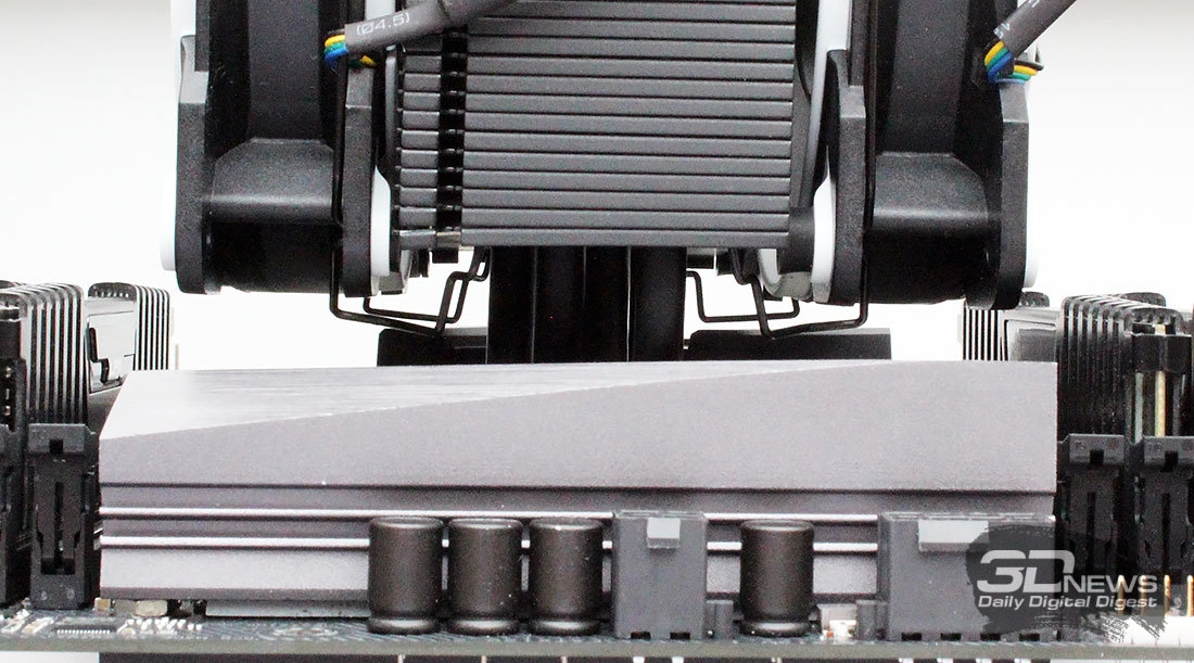 Установленный на плату кулер даже с двумя вентиляторами не создаст помех ни радиаторам на VRM материнской платы, ни высоким модулям оперативной памяти.