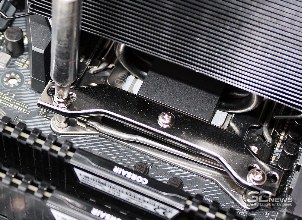 Они притягиваются винтами к отверстиям в опорной пластине процессорного разъёма (LGA2066). Только не забываем делать это равномерно, а также предварительно нанести термоинтерфейс.