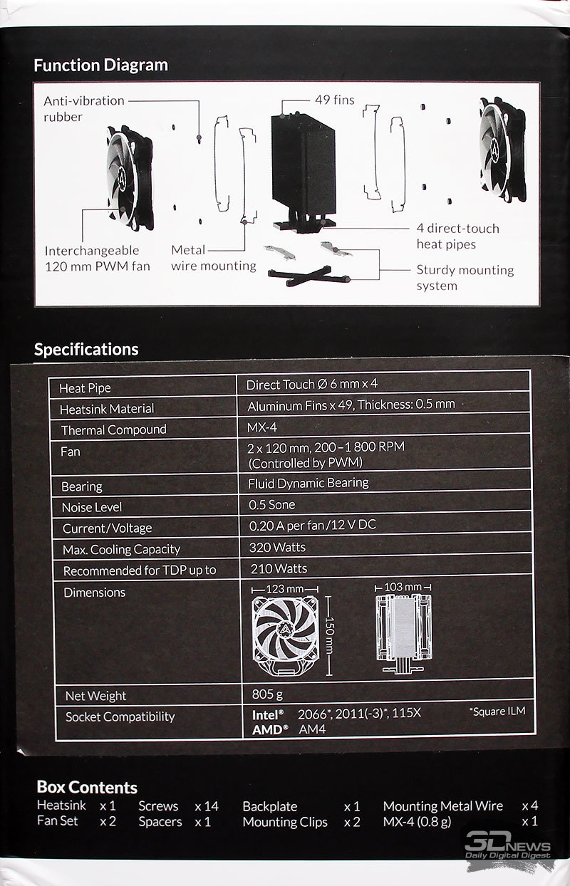 | Дополнительно (особенности) | Четыре варианта расцветки вентиляторов: зелёный, жёлтый, белый и красный, термопаста Arctic MX-4 0,8 г (8,5 Вт/м°К) | Возможность установки второго 120-мм вентилятора, термопаста Arctic MX-4 0,8 г (8,5 Вт/м°К) |