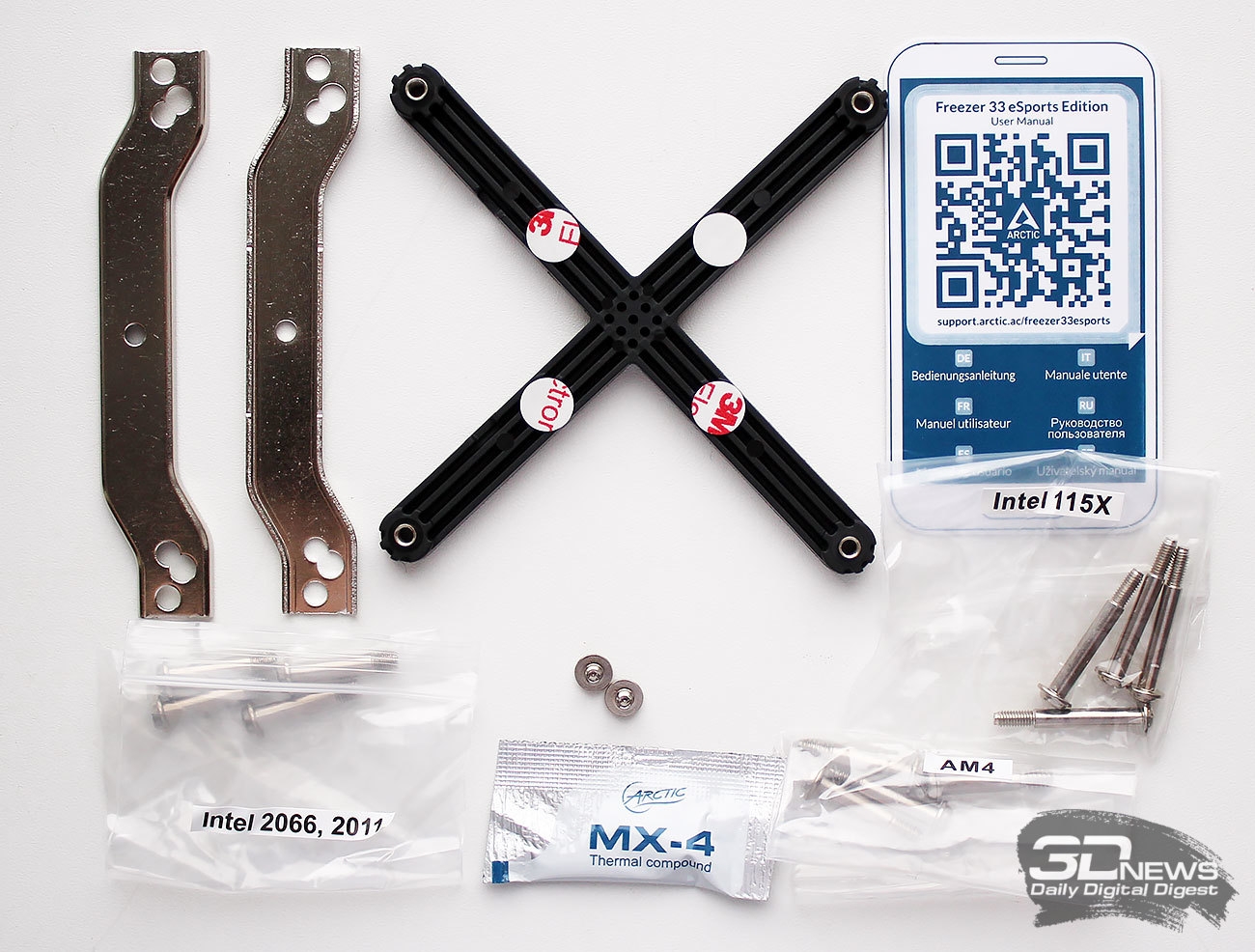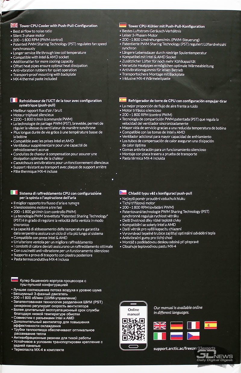 В сравнении с Freezer 33, из комплекта поставки исчезли силиконовые шайбы для вентиляторов, которые теперь приклеены прямо на рамку вентиляторов. Всё остальное здесь представлено в том же самом виде, включая пакетик с термопастой Arctic MX-4.