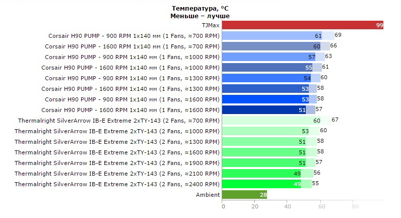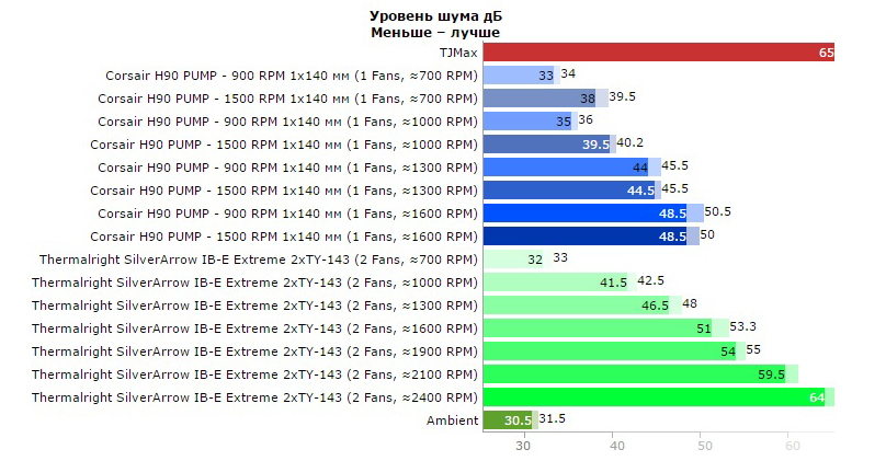 По итогам этого теста работа помпы Corsair H90 разочаровала, поскольку ее шум мешает показать хорошие результаты звукового давления, делая «водянку» шумной. Проблему можно решить подключением помпы через реобас или резистор, благо на уровне ниже 1000 об/мин она не будет напоминать о себе так сильно, но расплачиваться за это придется снижением производительности СВО.
