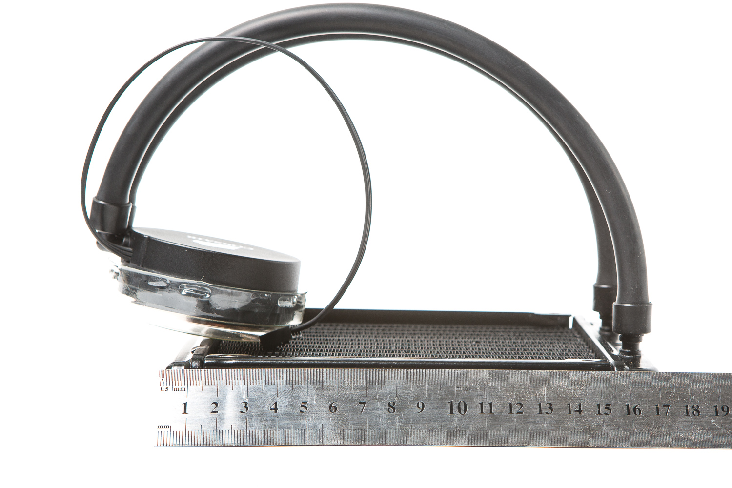 Толщина самого радиатора равна примерно 28 мм, а масса СЖО без вентилятора – ~400 г.