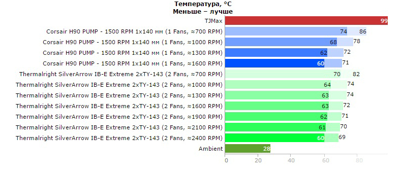 Ситуация остается той же. При низких оборотах вентиляторов СЖО Corsair проигрывает своему оппоненту, но при увеличении оборотов начинает отыгрываться.