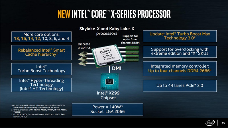 В отличие от нежданных решений AMD Ryzen Threadripper о грядущем обновлении HEDT-платформы Intel было известно уже давно. В начале лета на смену процессорному разъёму LGA2011-3 пришёл LGA2066 вместе с чипами Skylake-X и Kaby Lake-X, а также набором системной логики Intel X299.