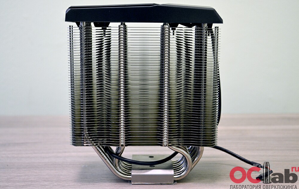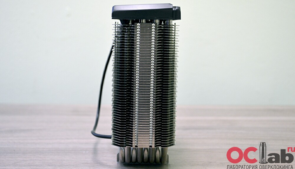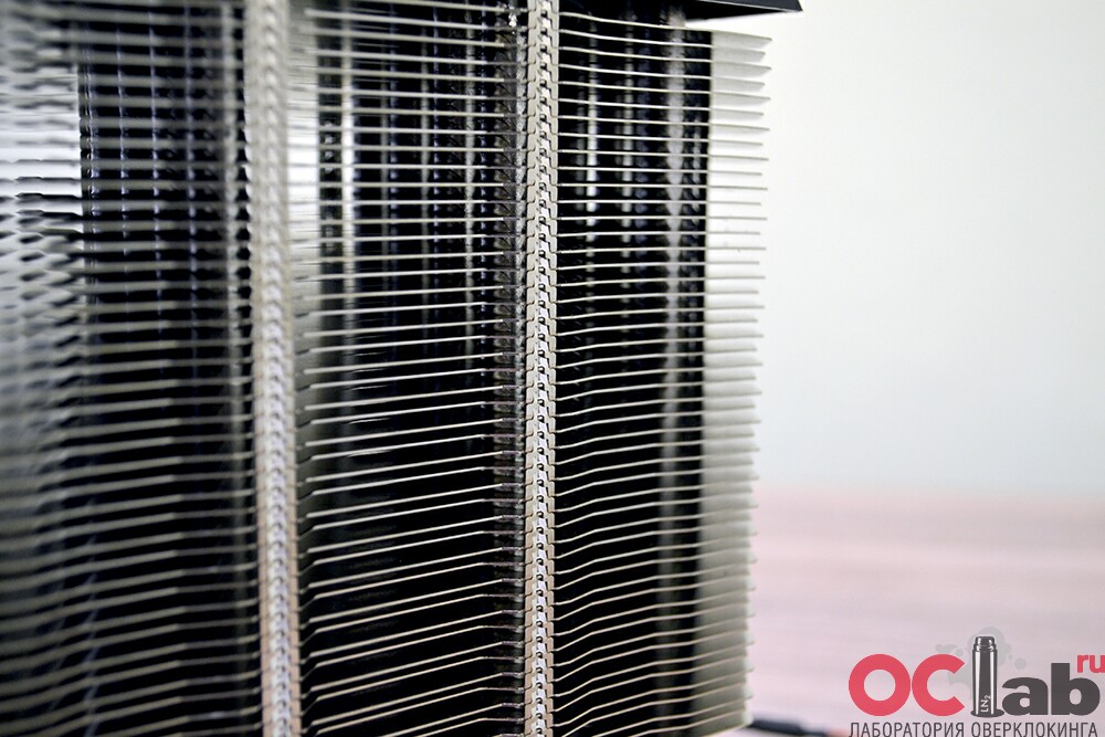 Радиатор имеет традиционную башенную компоновку, тонкие алюминиевые ребра нанизаны на тепловые трубки. Толщина каждого из пятидесяти ребер примерно 0.1-0.2 мм. Столь массивный радиатор позволяет кулеру рассеивать в окружающую среду до 250 Вт тепла. В данные рамки легко укладываются даже многоядерные процессоры Skylake-X с разгоном до 4.5-4.6 ГГц.